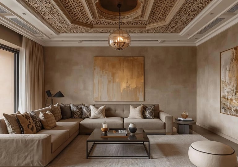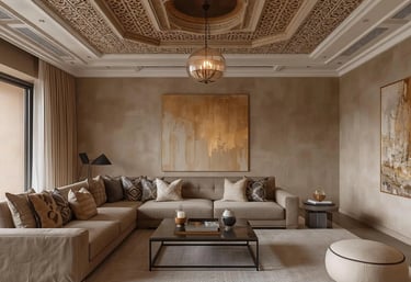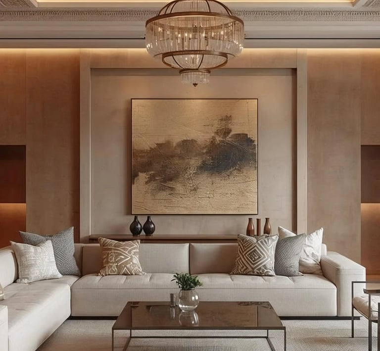 Pack Salon : Un ensemble décoratif harmonieux mêlant miroir, coussins artisanaux, luminaire, décoration murale, accroches , heurtoirs, lustre et applique en cuivre.